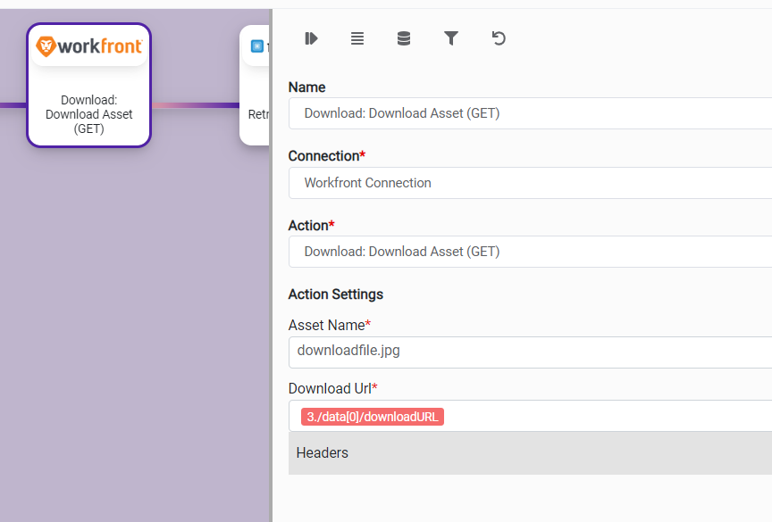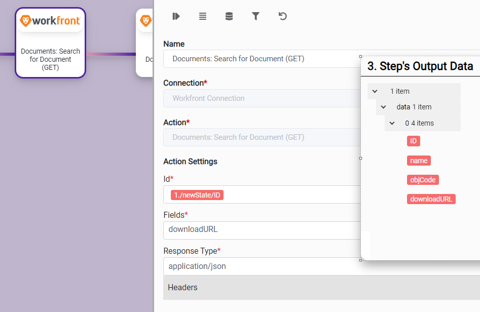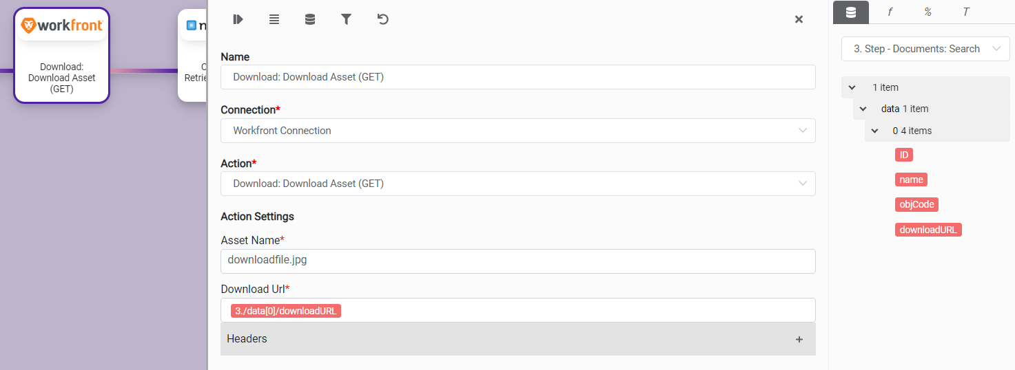 Download URL can be any valid resource file URL or we can use the document retrieved from the document search action as shown in the below image.