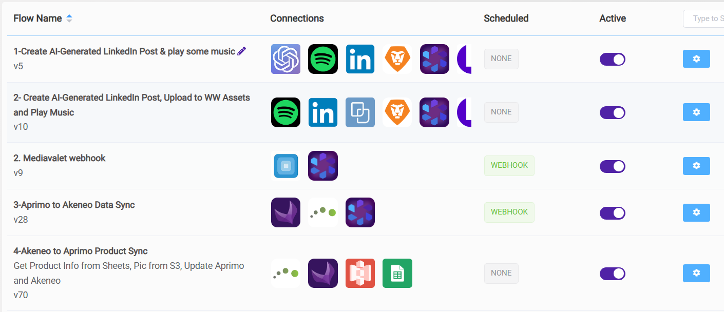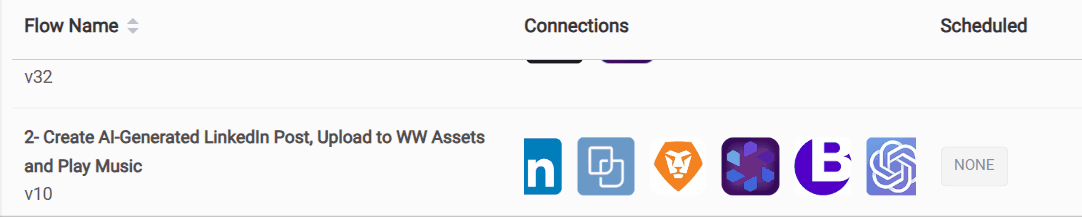 The Connection column displays all of the connections utilized in the flow, accompanied by their respective logos.
