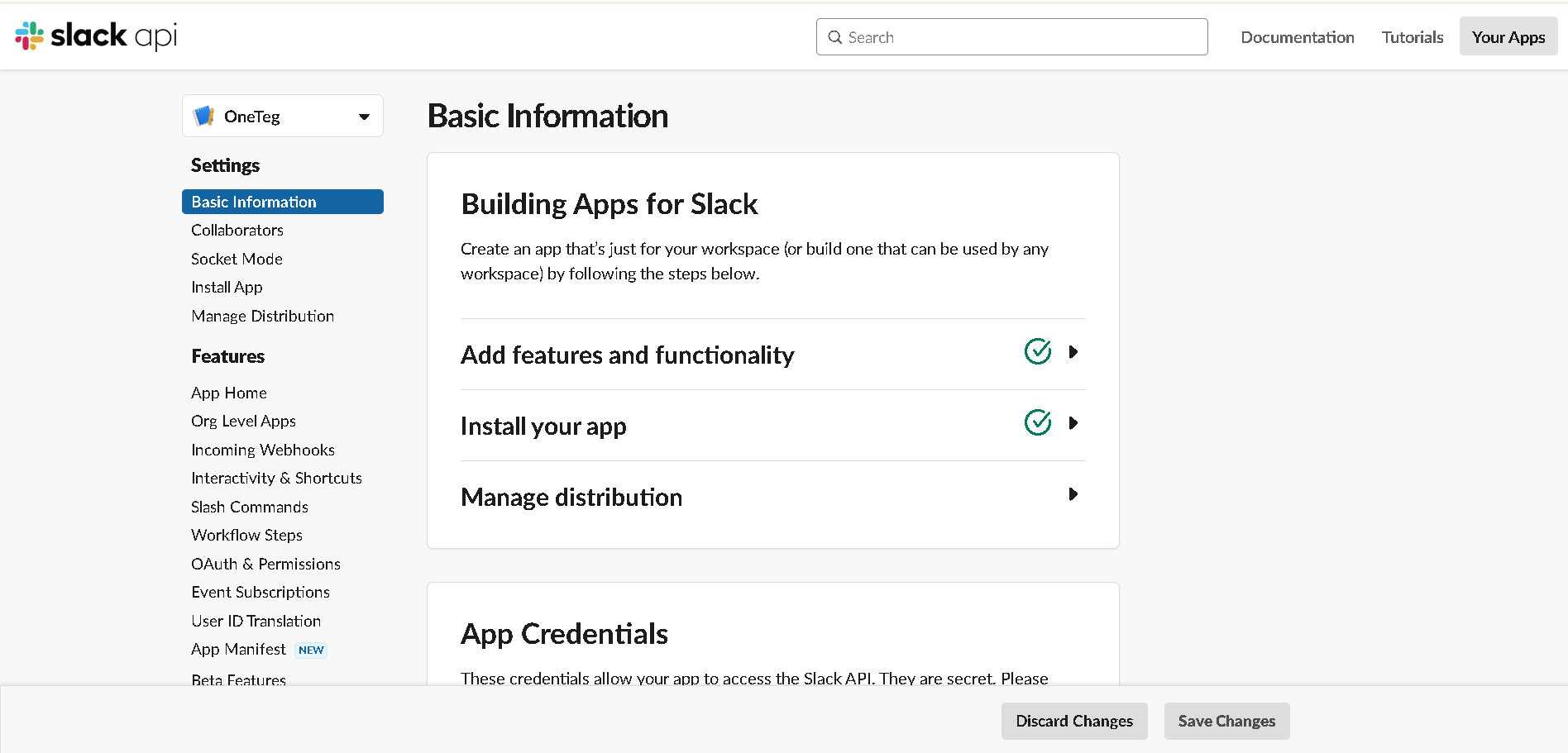 If we use OAuth as authentication type in OneTeg for Slack connector it creates Bot token. Bot Token has some restrictions, it can not perform actions on behalf of user like sending a message, deleting message, getting conversation history etc. In order to create User Token we firstly have to create App for our workspace.