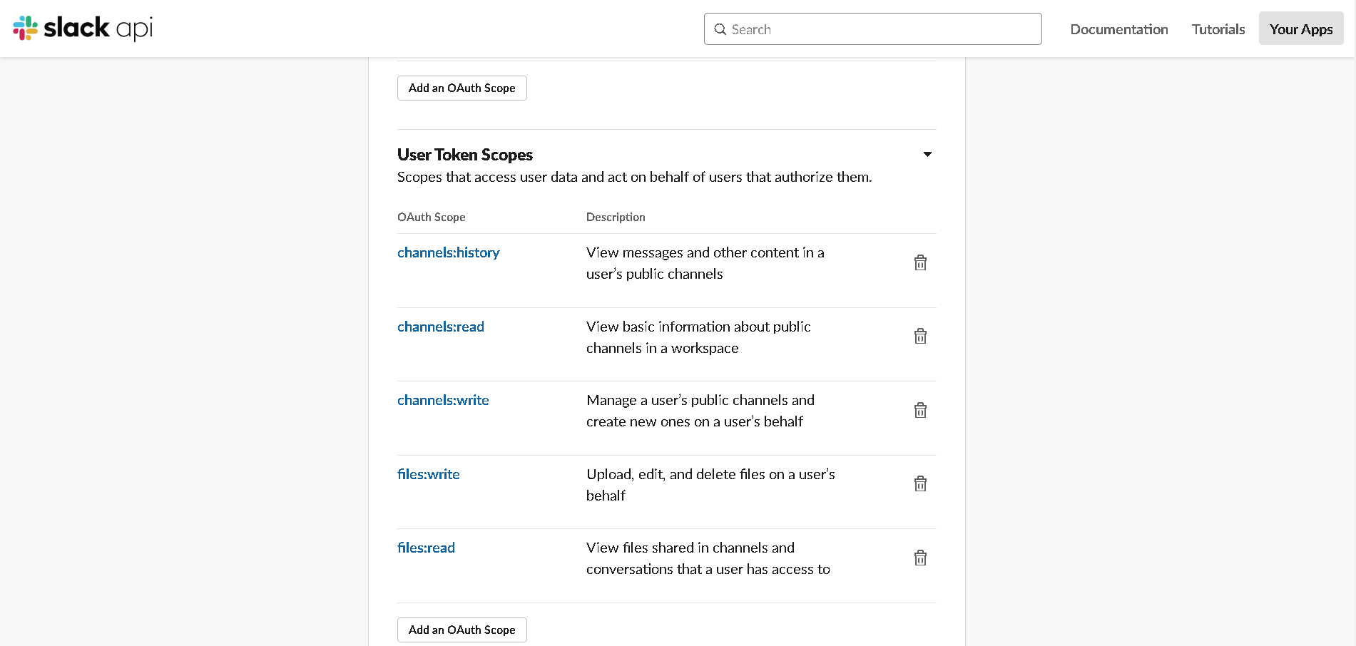 Scopes define the API methods an app is allowed to call, which information and capabilities are available on the workspace it’s installed on. Many scopes are restricted to specific resources like channels or files.