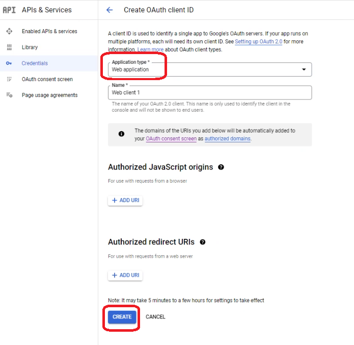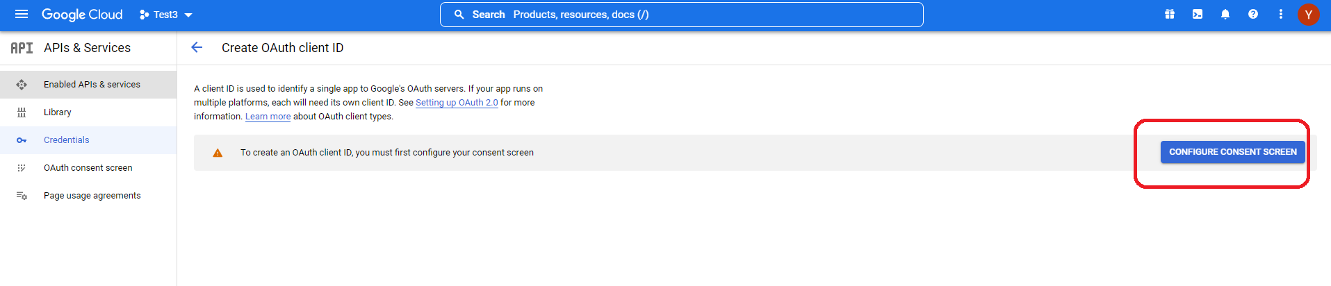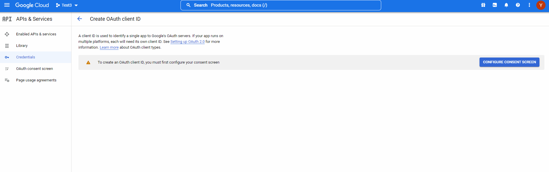We need to add a new credential. Select APIs & Services selection from the left menu table and select “Credentials”. From the new page, on the top side select “Create Credentials” and select “OAuth Client ID”