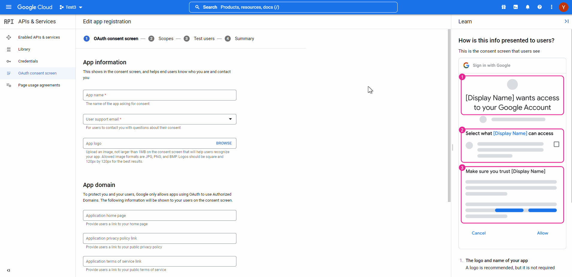 First enter your App information, user support mail, App logo (if any), and other necessary information. Please remember to add the “Developer Contact Information” mail address at the end of the first page. User support mail address will be selected as the same address the Google Account used to open this cloud space.