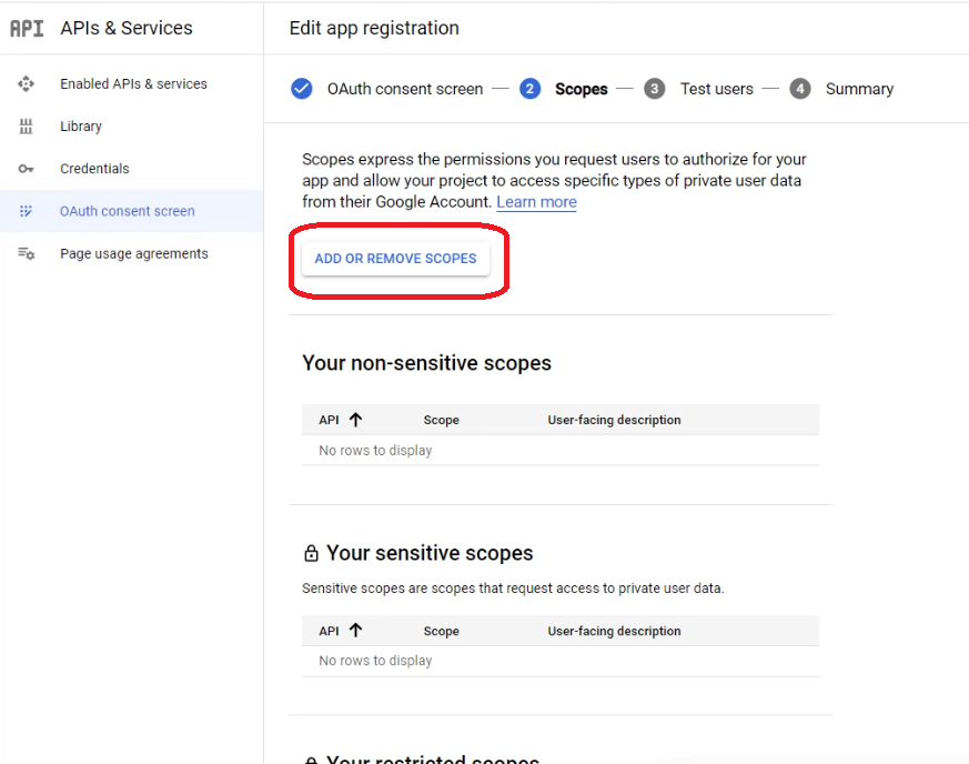 Press the “Add or Remove Scopes” button and select the required scopes as shown below: