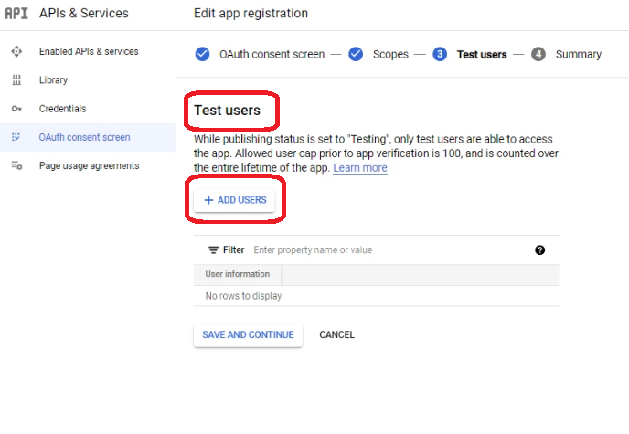 In the next screen, we will add Test User accounts to this App. Press the Add Users button and add the Google user account that you are currently logged in to (for us this is the onetegtest@gmail.com)