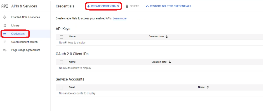 Click the Credentials button on the left side menu and click Create Credentials button at the top menu.