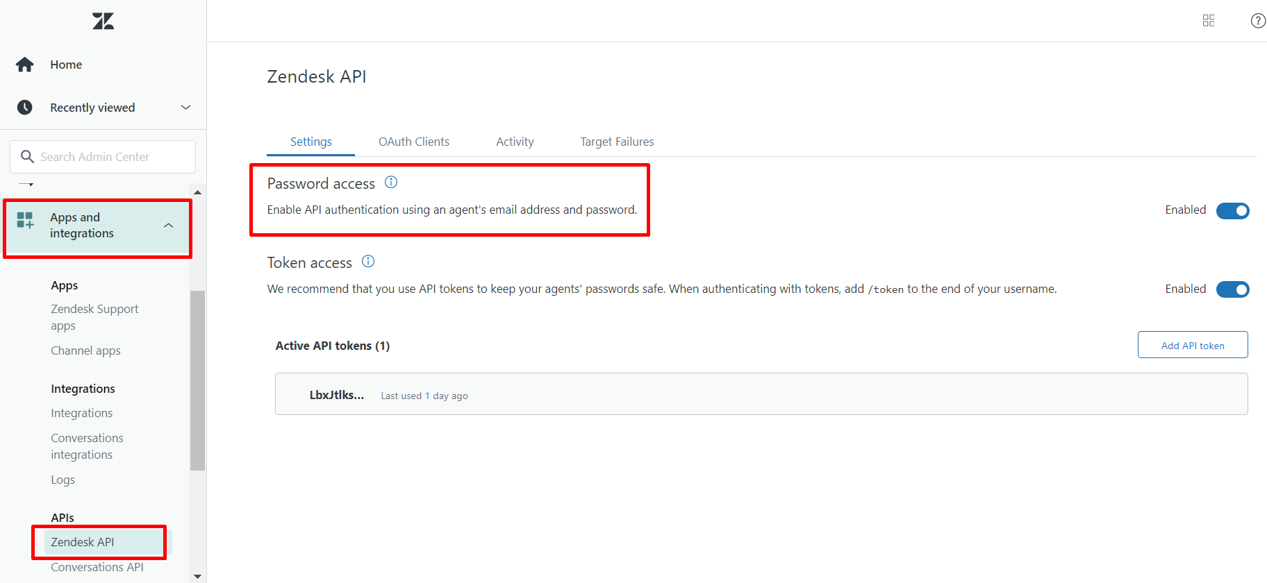 For basic authentication, enable the first option “Password access“. With basic authentication we only need username and password to configure zendesk connection on Oneteg.
