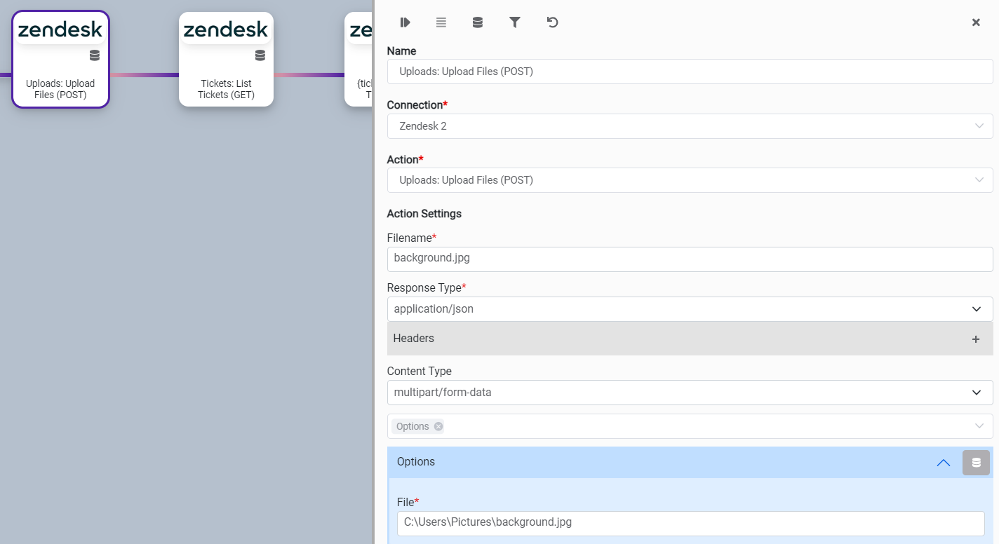 Action Description | Uploads a file that can be attached to a ticket comment. It doesn't attach the file to the comment. For details and examples, see Attaching ticket comments with the API. The endpoint has a required | ||